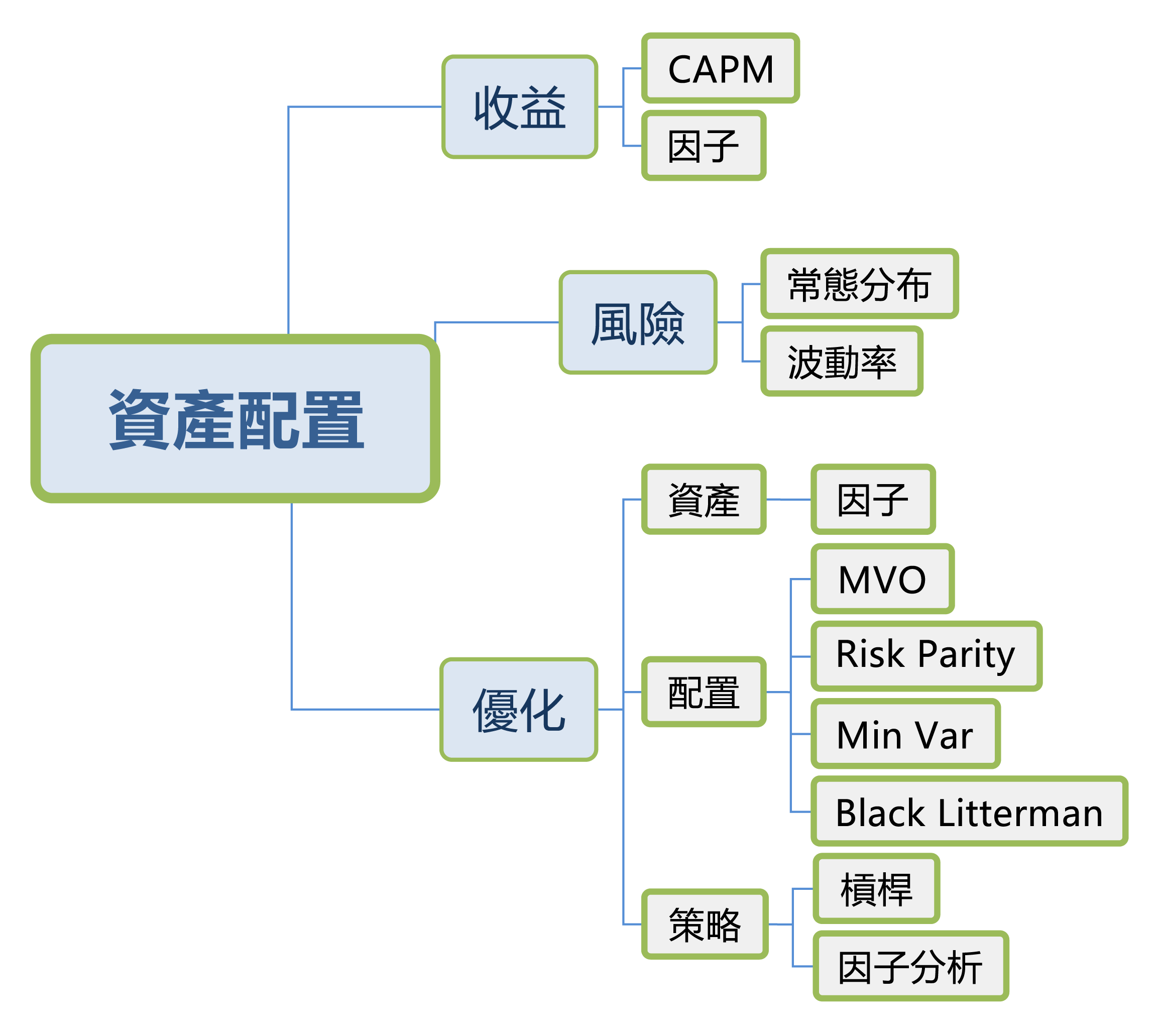 現在我們有收益也有風險,而優化又可以分成資產、配置和策略三個方面。