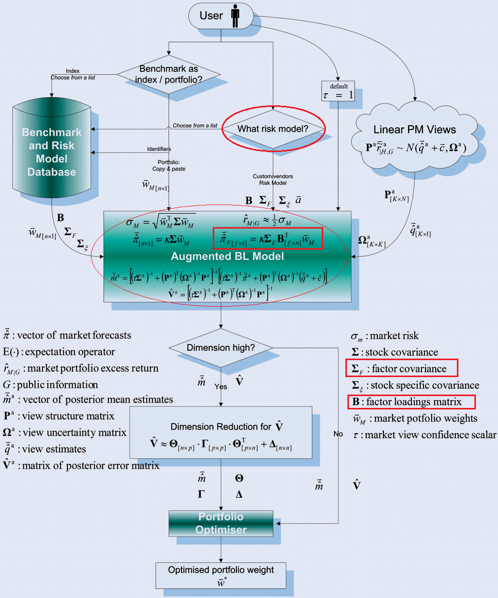 你說Black Litterman在哪裡? 我曾在文內提過至少有三種方式,能結合因子、投資者判斷和資產優化。最簡單的方式,依然是將大類資產替換成風格因子,例如用價值因子替換股票,然後寫出觀點向量,再藉由BL把資訊導入優化流程。然而廣義一些,如果進一步利用資產和風險因子化的優勢,投資者應該先從市場組成下手,再結合自身看法,例如ABL模型。第三種方法是Entropy pooling,觀點輸入形式包含了因子化共變異數矩陣、風險、報酬等,而且能無縫結合衍生商品,讓我看到一些P/Q quant 融合的希望。