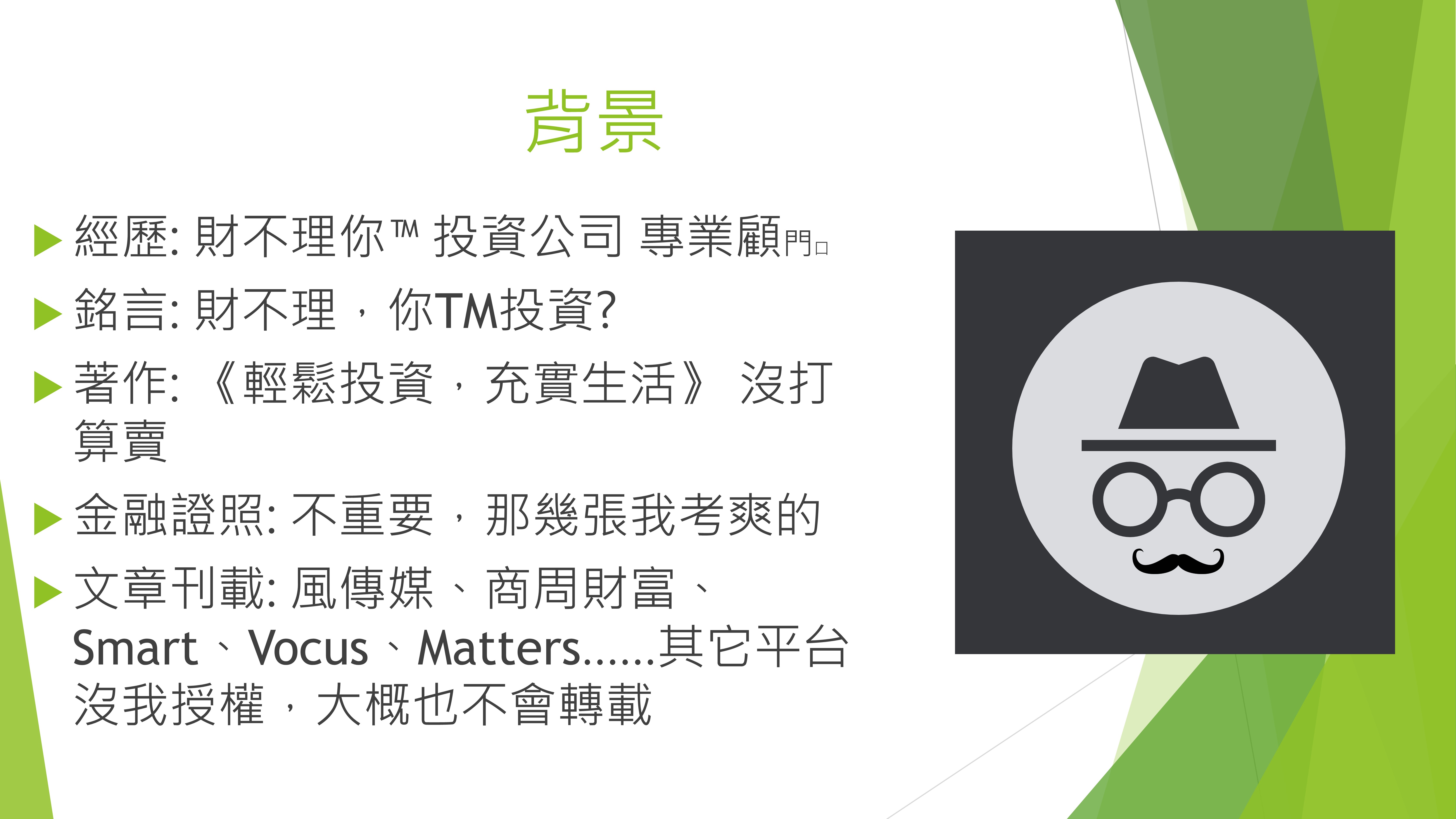 論投資背景,有人專做高成交量的短線,有人用總體經濟和技術分析交易股票,有人投資房地產和債券,有人常併購集團卻從不買股票......