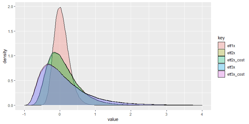 然而檢視報酬分布,期望值是隨槓桿率單調上升的。