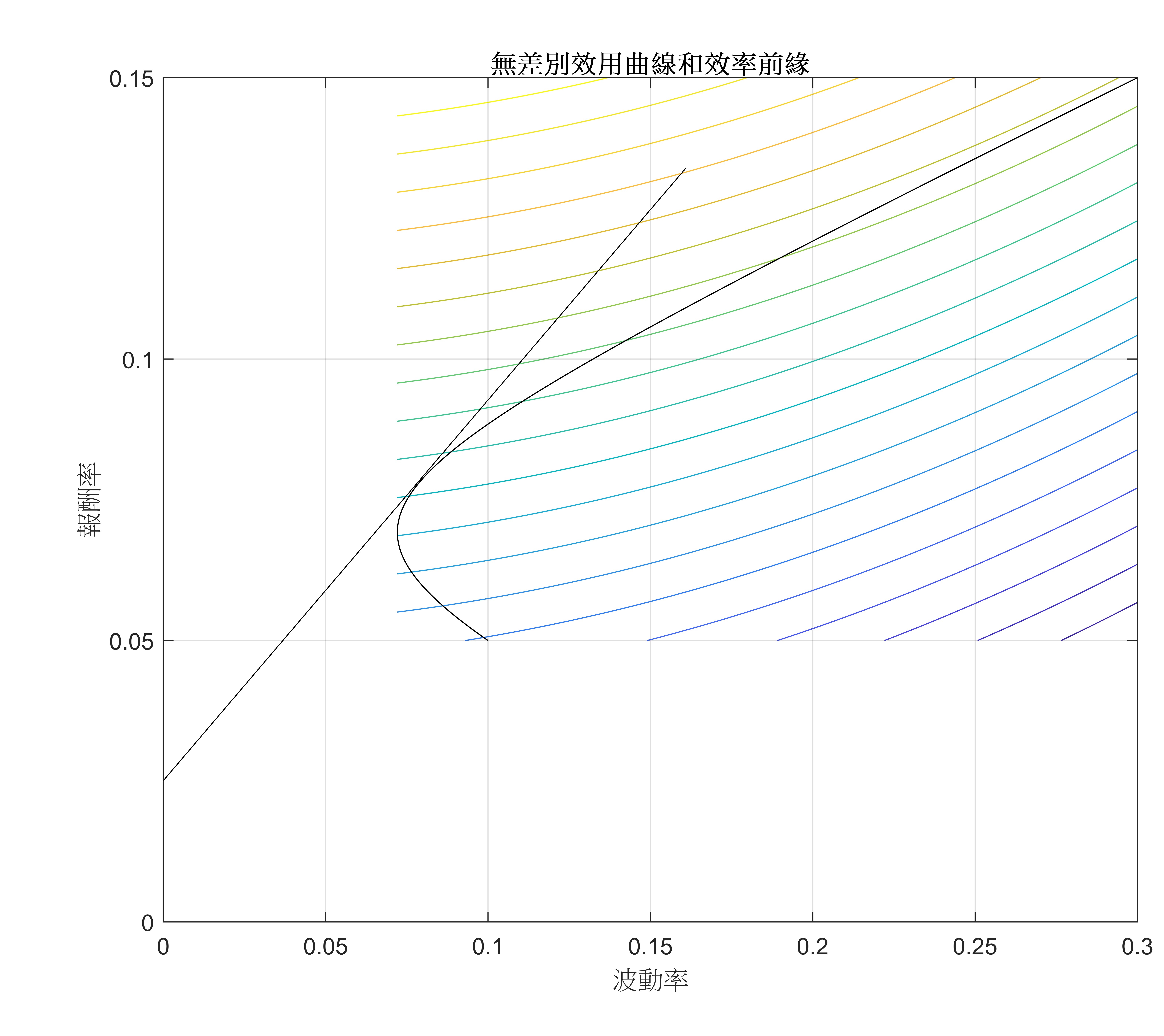 下圖是我畫的一組案例,包括效率前緣和無差異效用曲線。