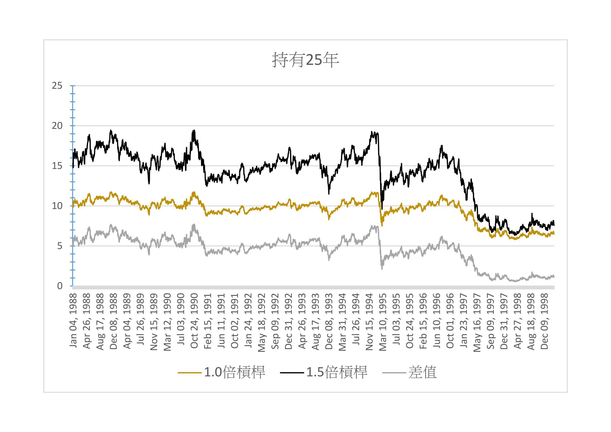 我又測試了持有25年的表現,這時1.5倍指數的勝率是100%,這也應證了「時間越長勝率越高」的理論。